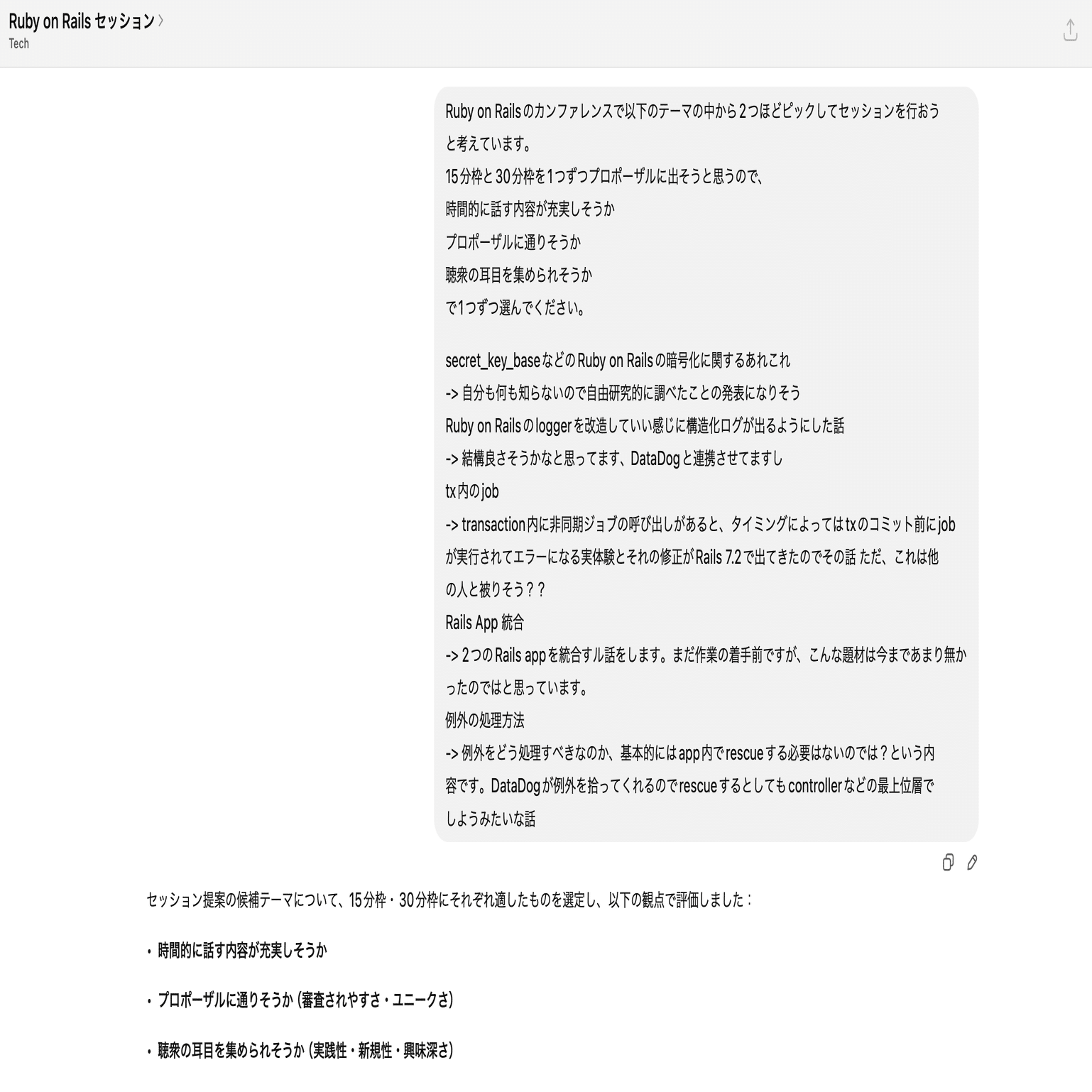 過去のタスクなどから、「アレがいいかな?コレがいいかな?」みたいに思ったことを、フワッと AI に投げてみて絞り込みながら形にしていくようなイメージで、AI と一緒にセッション内容を決めていきました。やっぱり、AI はこういう時に便利ですよね。