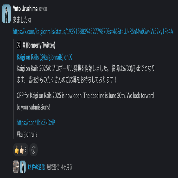 とはいえ、いつから Kaigi on Rails の CFP の募集が始まるのかを知らなかったので、公式の X(@kaigionrails)をフォローしながら待っていました。